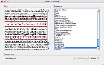 If you click on one of the fonts in the font list at the left of the screen, you will see its name appear at the bottom of the window. To exclude a selected font, click the Exclude button. You will see its name appear in the Exclusions list. If you change your mind and want to allow the font again, click the Allow button. You can speed up this process by double clicking a font in the font list to toggle between allowing or excluding.